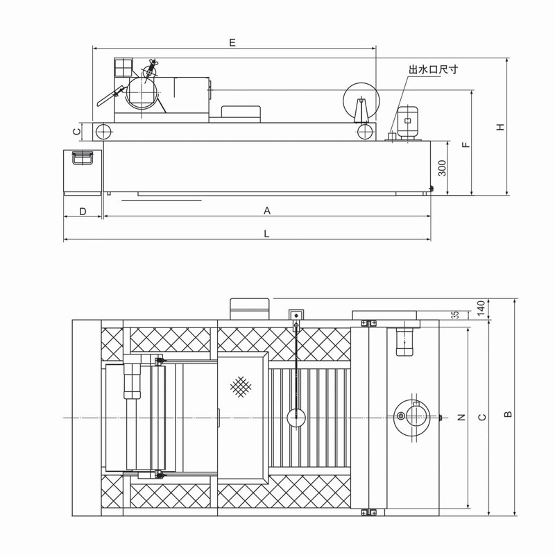 | 型號 | 容積L | 流量L/min | 電機(jī)功率 | A | C | D | E | F | N | M | 入水口 | L*B*H |